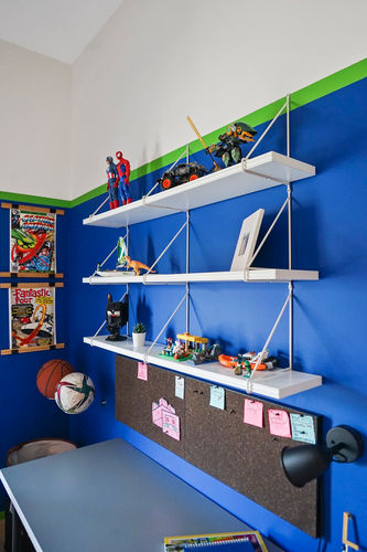 Welcome to a special bedroom for a pre-teen boy, Luka, who is starting to express and explore his style while still holding on to his favorite childhood hobbies–sports, comical book characters, and Legos. In fact, most of the styling in this bedroom are items that Luka has made himself. Unlike his sisters’ room, the overall style of this bedroom could not be too themed, as it is required toalso function as a guest room when needed. Therefore, this is a sophisticated scheme and palette; bold, but still very much tailored to Lukas unique personality and interests.